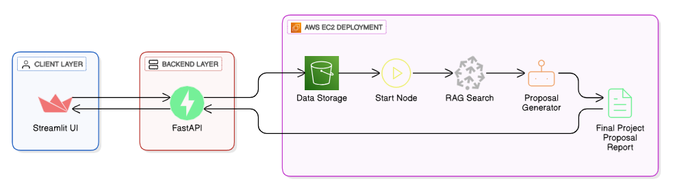 - Knowledge Retrieval: Pinecone searches the masked and vectorized corpus for similar projects and internal guidance notes, returning the top-ranked contextual data.